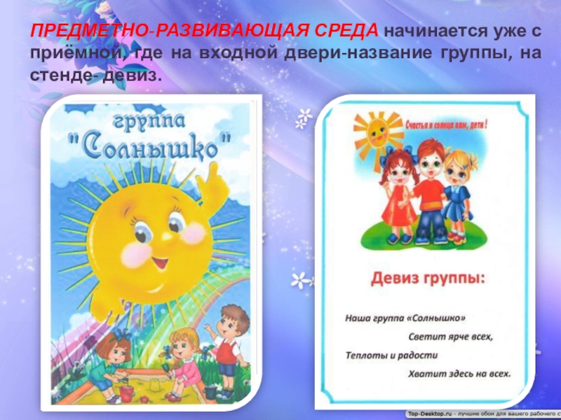 Слайд 5ПРЕДМЕТНО-РАЗВИВАЮЩАЯ СРЕДА начинается уже с приёмной, где на входной двери-название группы,
