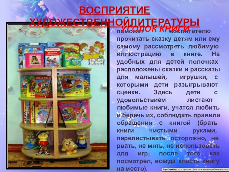 в книге. На удобных для детей полочках расположены сказки и рассказы для малышей, игрушки, с которыми дети разыгрывают сценки. Здесь дети с удовольствием листают любимые книги, учатся любить и беречь их, соблюдать правила обращения с книгой (брать книги чистыми руками, перелистывать осторожно, не рвать, не мять, не использовать для игр; после того как посмотрел, всегда класть книгу на место).