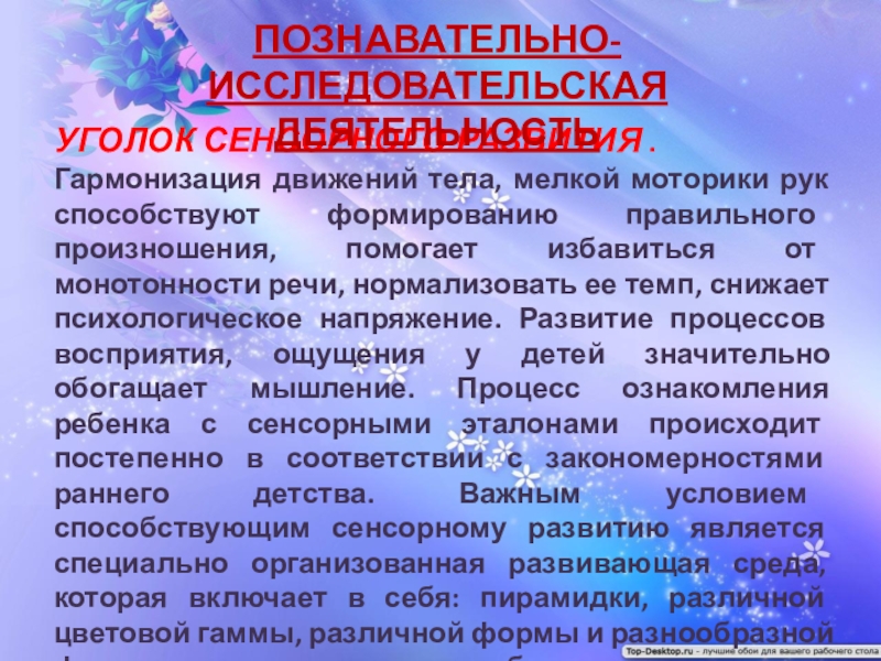 правильного произношения, помогает избавиться от монотонности речи, нормализовать ее темп, снижает психологическое напряжение. Развитие процессов восприятия, ощущения у детей значительно обогащает мышление. Процесс ознакомления ребенка с сенсорными эталонами происходит постепенно в соответствии с закономерностями раннего детства. Важным условием способствующим сенсорному развитию является специально организованная развивающая среда, которая включает в себя: пирамидки, различной цветовой гаммы, различной формы и разнообразной фактуры, шнуровки, разнообразные вкладыши, дидактически игры и т. д.