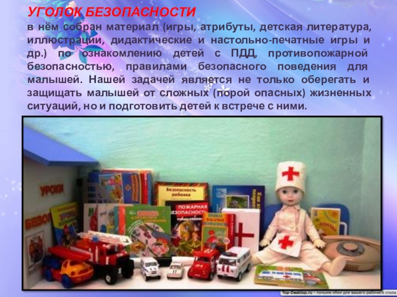 и настольно-печатные игры и др.) по ознакомлению детей с ПДД, противопожарной безопасностью, правилами безопасного поведения для малышей. Нашей задачей является не только оберегать и защищать малышей от сложных (порой опасных) жизненных ситуаций, но и подготовить детей к встрече с ними.