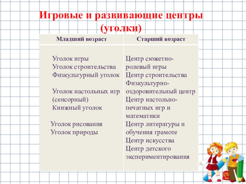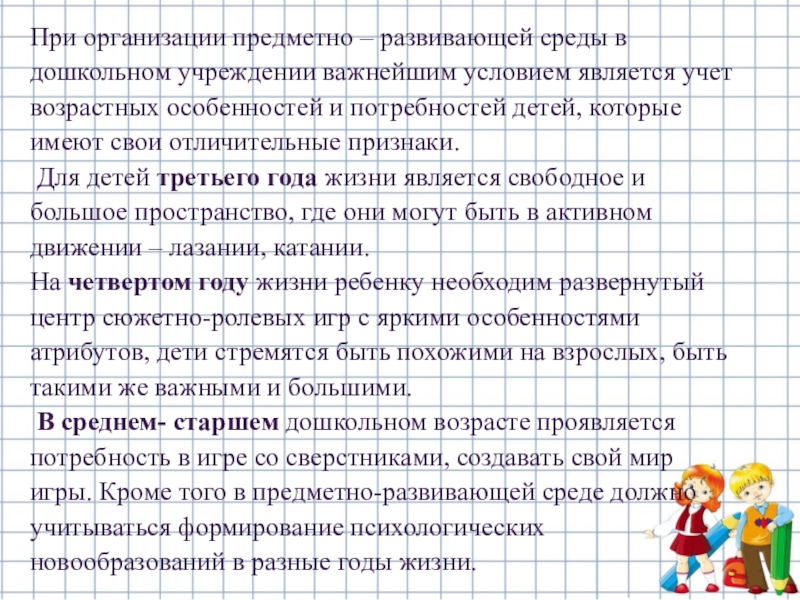 В среднем- старшем дошкольном возрасте проявляется потребность в игре со сверстниками, создавать свой мир игры. Кроме того в предметно-развивающей среде должно учитываться формирование психологических новообразований в разные годы жизни.
