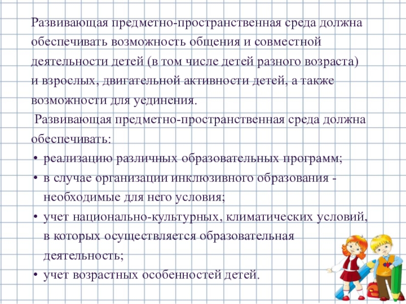 Слайд 4Развивающая предметно-пространственная среда должна обеспечивать возможность общения и совместной деятельности детей