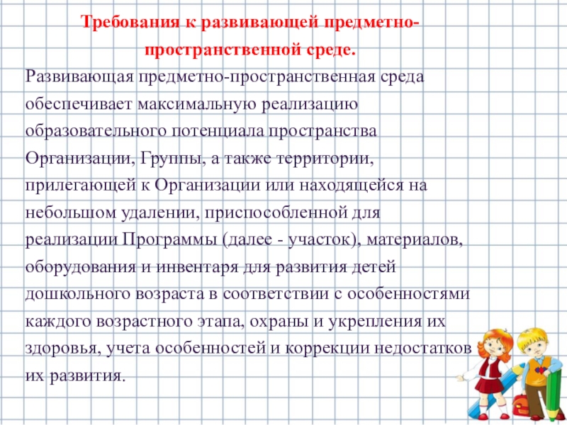 потенциала пространства Организации, Группы, а также территории, прилегающей к Организации или находящейся на небольшом удалении, приспособленной для реализации Программы (далее - участок), материалов, оборудования и инвентаря для развития детей дошкольного возраста в соответствии с особенностями каждого возрастного этапа, охраны и укрепления их здоровья, учета особенностей и коррекции недостатков их развития.