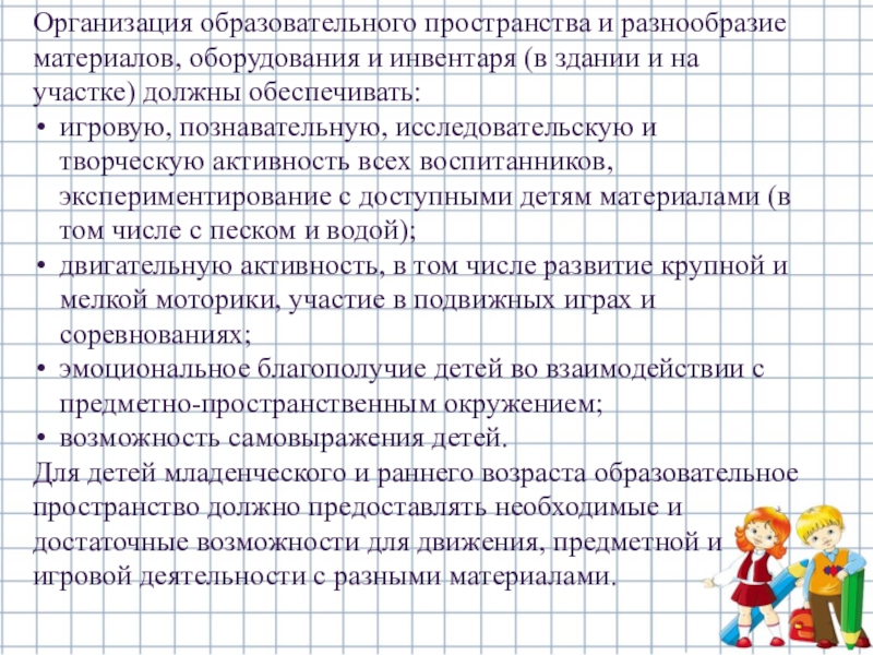 Для детей младенческого и раннего возраста образовательное пространство должно предоставлять необходимые и достаточные возможности для движения, предметной и игровой деятельности с разными материалами.
