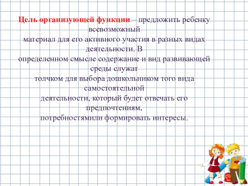 Слайд 29Цель организующей функции – предложить ребенку всевозможный