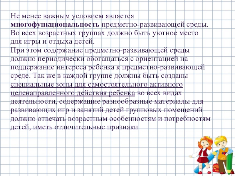 Слайд 26Не менее важным условием является многофункциональность предметно-развивающей среды.