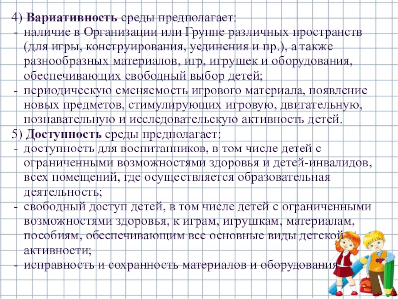 Слайд 5Развивающая предметно-пространственная среда должна быть содержательно-насыщенной, трансформируемой, полифункциональной, вариативной, доступной и