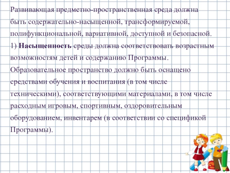1) Насыщенность среды должна соответствовать возрастным возможностям детей и содержанию Программы.
