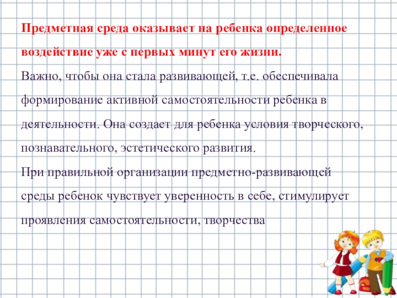 Важно, чтобы она стала развивающей, т.е. обеспечивала формирование активной самостоятельности ребенка в деятельности. Она создает для ребенка условия творческого, познавательного, эстетического развития.