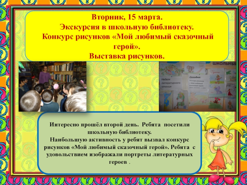 Наибольшую активность у ребят вызвал конкурс рисунков «Мой любимый сказочный герой». Ребята с удовольствием изображали портреты литературных героев .