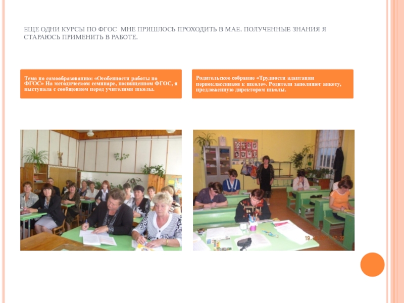 Тема по самообразованию: «Особенности работы по ФГОС» На методическом семинаре, посвященном ФГОС, я выступала с сообщением перед учителями школы.