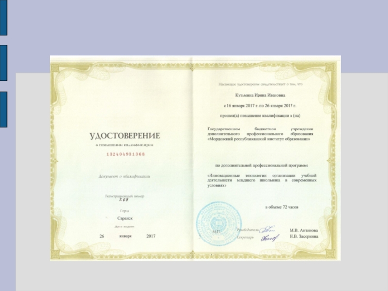 Профессиональное образование: МГПИ имени М. Е. Евсевьева. Диплом УВ № 325924, дата выдачи.06.07. 1990г., специальность –педагогика и методика начального обучения, квалификация-учитель начальных классов.