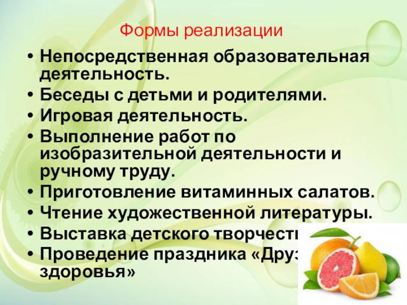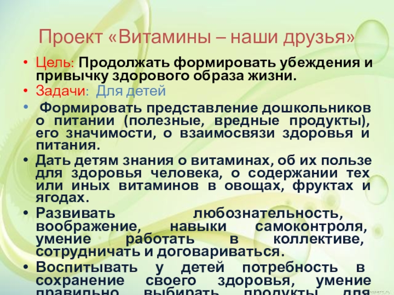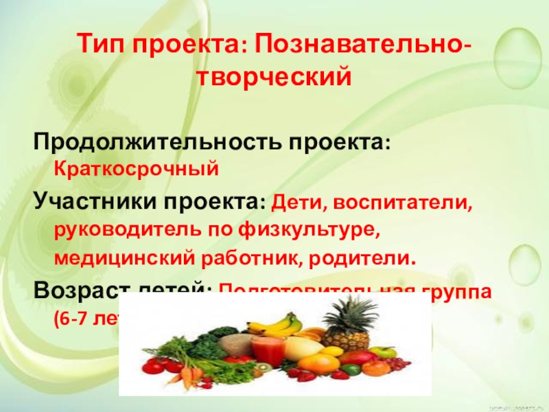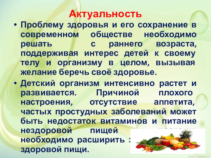 Детский организм интенсивно растет и развивается. Причиной плохого настроения, отсутствие аппетита, частых простудных заболеваний может быть недостаток витаминов и питание нездоровой пищей – поэтому необходимо расширить знания детей о здоровой пищи.