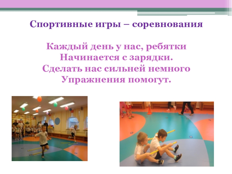 Слайд 4Спортивные игры – соревнования Каждый день у нас, ребятки Начинается с зарядки. Сделать нас