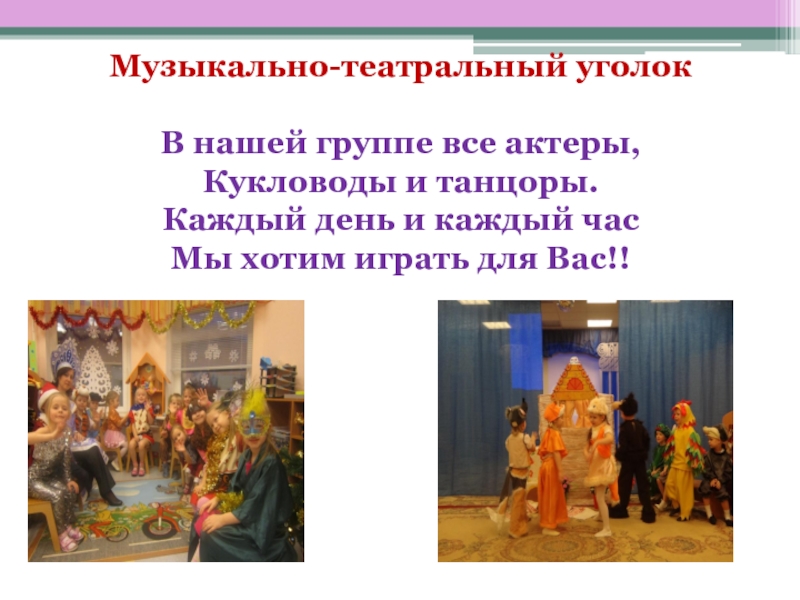 Слайд 3 Музыкально-театральный уголок В нашей группе все актеры, Кукловоды и танцоры. Каждый день и каждый