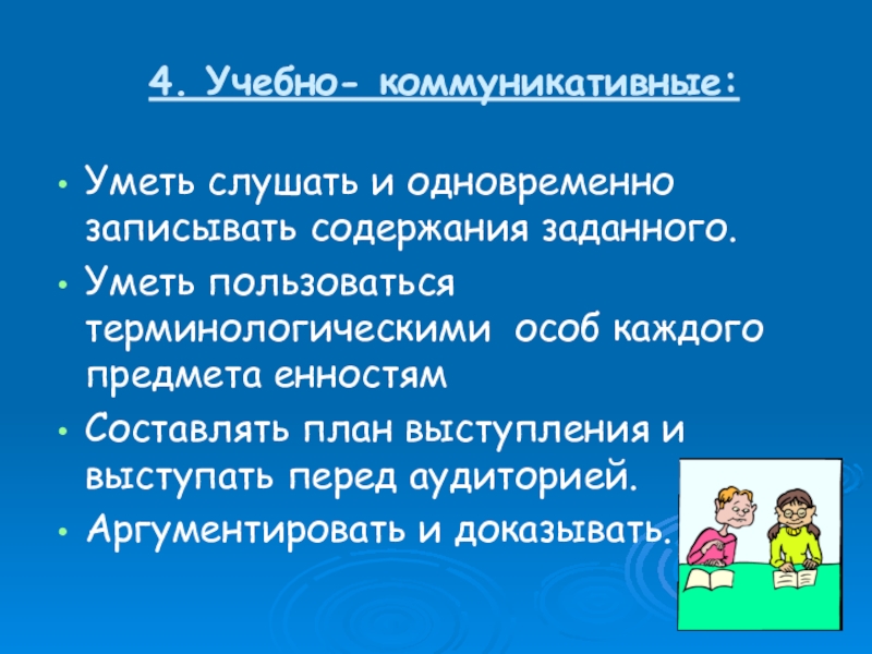 4. Учебно- коммуникативные:Уметь слушать и одновременно записывать содержания заданного.Уметь пользоваться терминологическими особ каждого предмета енностямСоставлять план выступления