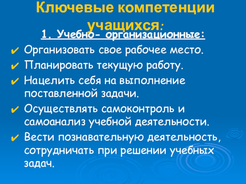 Ключевые компетенции учащихся:1. Учебно- организационные:Организовать свое рабочее место.Планировать текущую работу.Нацелить себя на выполнение поставленной задачи.Осуществлять самоконтроль и