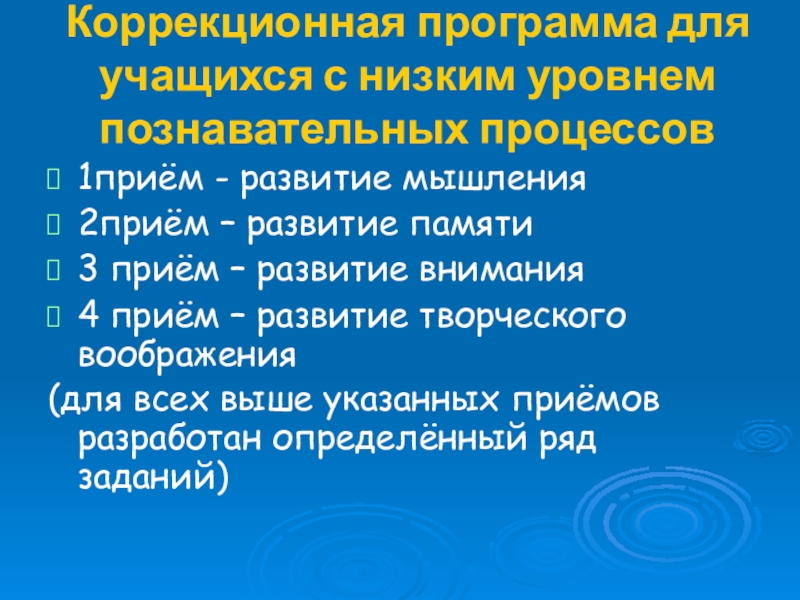Коррекционная программа для учащихся с низким уровнем познавательных процессов1приём - развитие мышления2приём – развитие памяти3 приём –