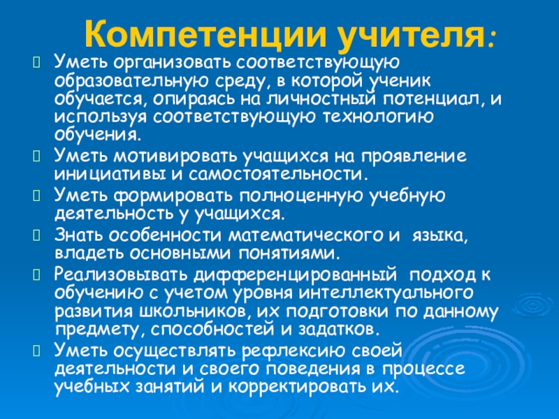 Компетенции учителя:Уметь организовать соответствующую образовательную среду, в которой ученик обучается, опираясь на личностный потенциал, и используя соответствующую