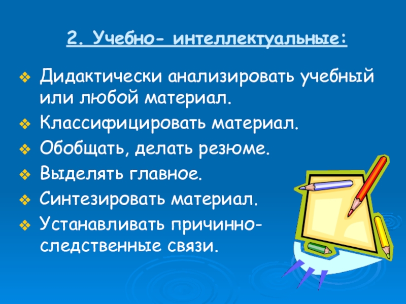 2. Учебно- интеллектуальные:Дидактически анализировать учебный или любой материал.Классифицировать материал.Обобщать, делать резюме.Выделять главное.Синтезировать материал.Устанавливать причинно- следственные связи.