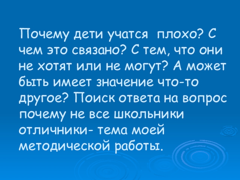 они не хотят или не могут? А может быть имеет значение что-то другое? Поиск ответа на вопрос почему не все школьники отличники- тема моей методической работы.