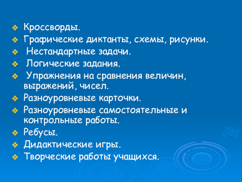 Кроссворды.Графические диктанты, схемы, рисунки. Нестандартные задачи. Логические задания. Упражнения на сравнения величин, выражений, чисел.Разноуровневые карточки.Разноуровневые самостоятельные и