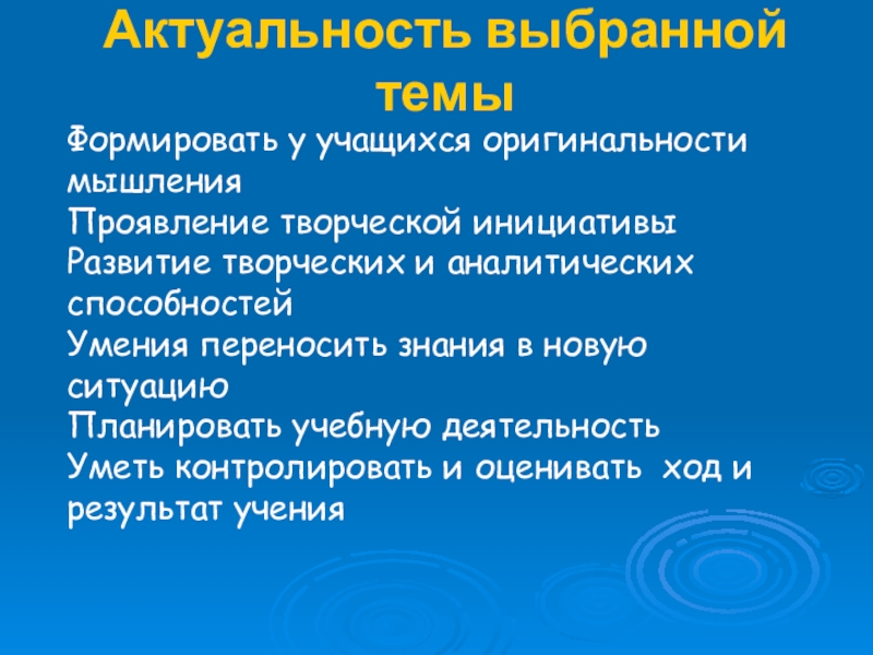 Актуальность выбранной темы  Формировать у учащихся оригинальности мышленияПроявление творческой инициативыРазвитие творческих и аналитических способностейУмения переносить знания