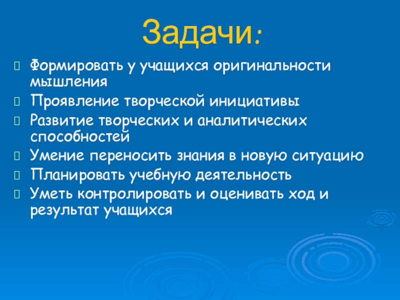 Задачи:Формировать у учащихся оригинальности мышленияПроявление творческой инициативыРазвитие творческих и аналитических способностейУмение переносить знания в новую ситуациюПланировать учебную
