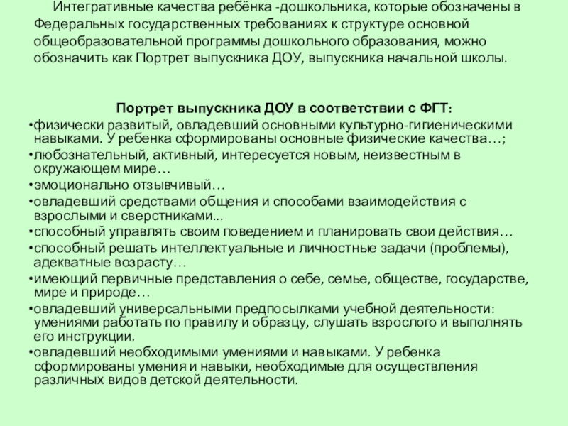 Портрет выпускника ДОУ в соответствии с ФГТ: