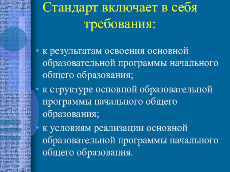 Стандарт) представляет собой совокупность требований, обязательных при реализации основной образовательной программы начального общего образования образовательными учреждениями, имеющими государственную аккредитацию.