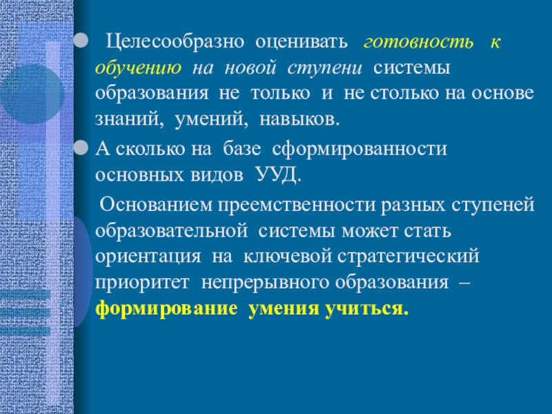 Основанием преемственности разных ступеней образовательной системы может стать ориентация на ключевой стратегический приоритет непрерывного образования – формирование умения учиться.