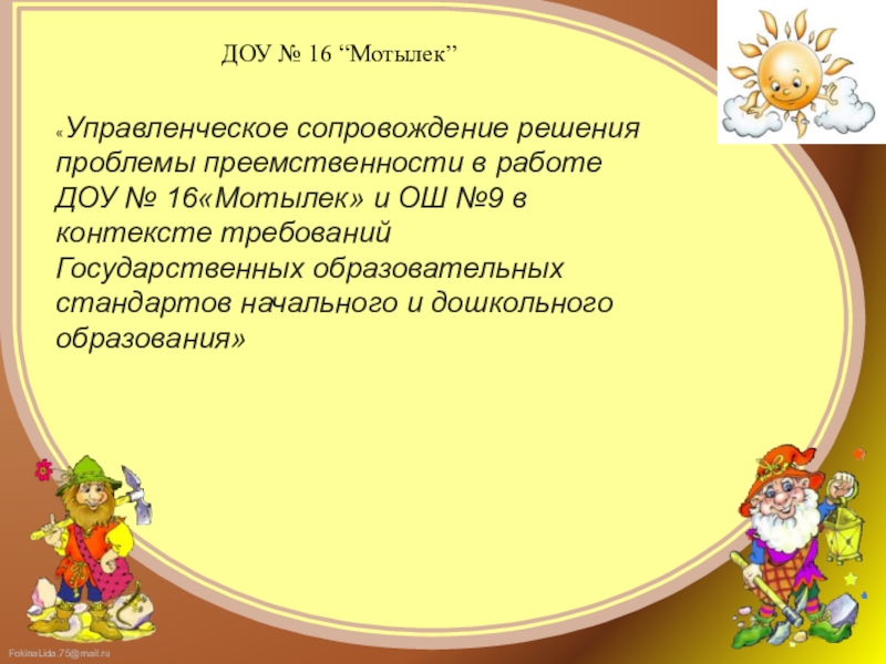 «Управленческое сопровождение решения проблемы преемственности в работе ДОУ № 16«Мотылек» и ОШ №9 в контексте требований Государственных образовательных стандартов начального и дошкольного образования»