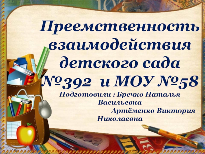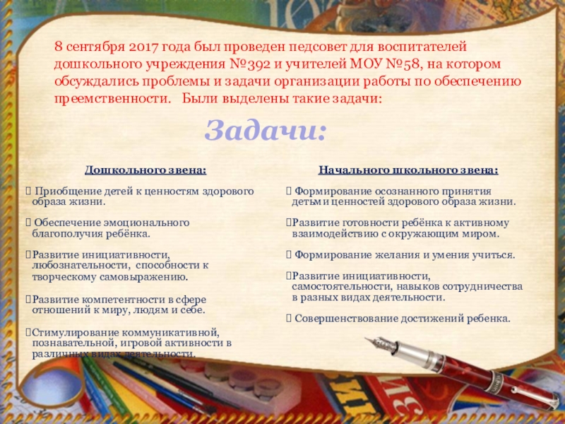 8 сентября 2017 года был проведен педсовет для воспитателей дошкольного учреждения №392 и учителей МОУ №58, на котором обсуждались проблемы и задачи организации работы по обеспечению преемственности. Были выделены такие задачи: