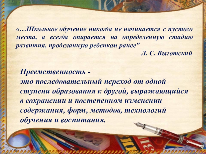 «…Школьное обучение никогда не начинается с пустого места, а всегда опирается на определенную стадию развития, проделанную ребенком ранее"