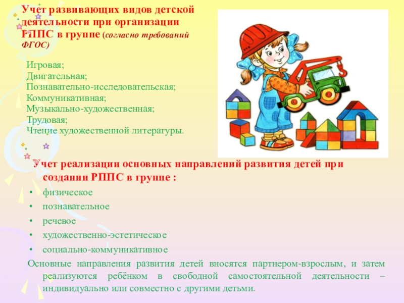 Основные направления развития детей вносятся партнером-взрослым, и затем реализуются ребёнком в свободной самостоятельной деятельности – индивидуально или совместно с другими детьми.