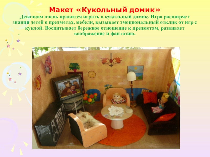 3. Создать условия для обеспечения разных видов деятельности дошкольников (игровой, двигательной, интеллектуальной, самостоятельной, творческой, художественной, театрализованной).
