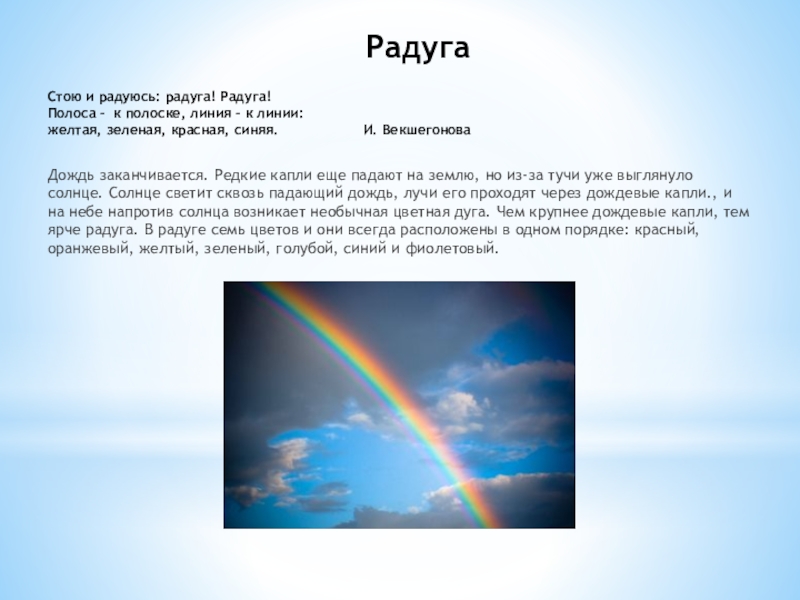 Дождь заканчивается. Редкие капли еще падают на землю, но из-за тучи уже выглянуло солнце. Солнце светит сквозь падающий дождь, лучи его проходят через дождевые капли., и на небе напротив солнца возникает необычная цветная дуга. Чем крупнее дождевые капли, тем ярче радуга. В радуге семь цветов и они всегда расположены в одном порядке: красный, оранжевый, желтый, зеленый, голубой, синий и фиолетовый.