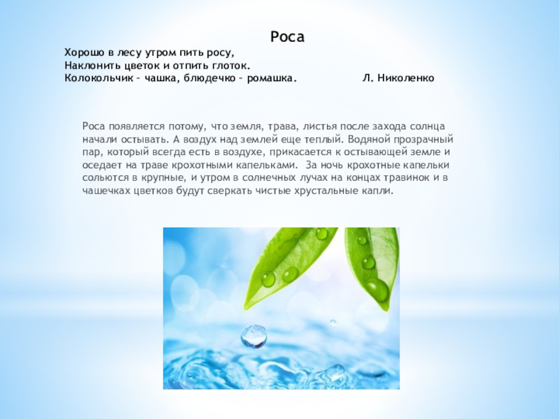 Роса появляется потому, что земля, трава, листья после захода солнца начали остывать. А воздух над землей еще теплый. Водяной прозрачный пар, который всегда есть в воздухе, прикасается к остывающей земле и оседает на траве крохотными капельками. За ночь крохотные капельки сольются в крупные, и утром в солнечных лучах на концах травинок и в чашечках цветков будут сверкать чистые хрустальные капли.
