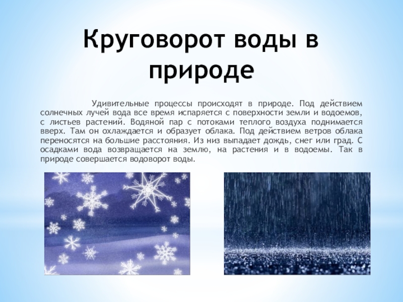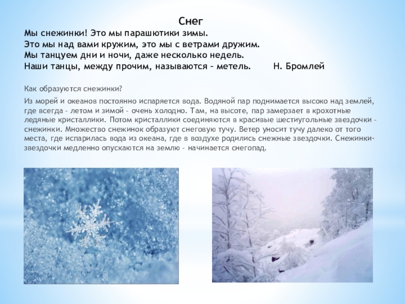 Из морей и океанов постоянно испаряется вода. Водяной пар поднимается высоко над землей, где всегда – летом и зимой – очень холодно. Там, на высоте, пар замерзает в крохотные ледяные кристаллики. Потом кристаллики соединяются в красивые шестиугольные звездочки – снежинки. Множество снежинок образуют снеговую тучу. Ветер уносит тучу далеко от того места, где испарилась вода из океана, где в воздухе родились снежные звездочки. Снежинки-звездочки медленно опускаются на землю – начинается снегопад.