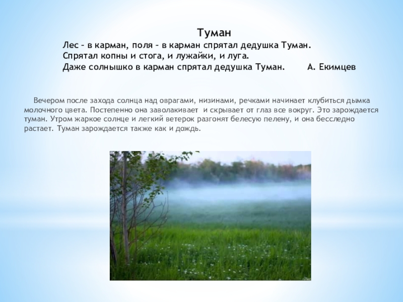 Вечером после захода солнца над оврагами, низинами, речками начинает клубиться дымка молочного цвета. Постепенно она заволакивает и скрывает от глаз все вокруг. Это зарождается туман. Утром жаркое солнце и легкий ветерок разгонят белесую пелену, и она бесследно растает. Туман зарождается также как и дождь.