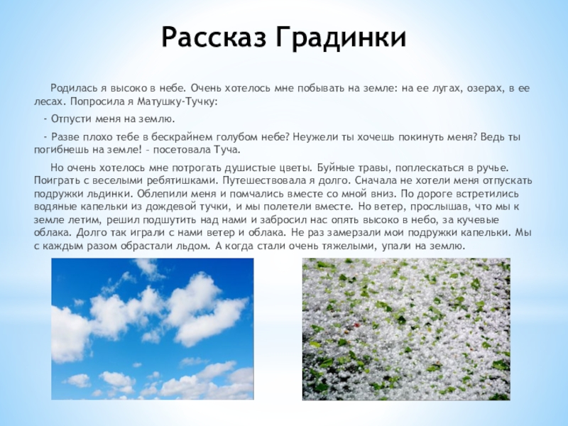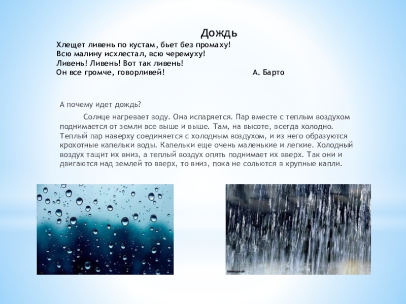Солнце нагревает воду. Она испаряется. Пар вместе с теплым воздухом поднимается от земли все выше и выше. Там, на высоте, всегда холодно. Теплый пар наверху соединяется с холодным воздухом, и из него образуются крохотные капельки воды. Капельки еще очень маленькие и легкие. Холодный воздух тащит их вниз, а теплый воздух опять поднимает их вверх. Так они и двигаются над землей то вверх, то вниз, пока не сольются в крупные капли.