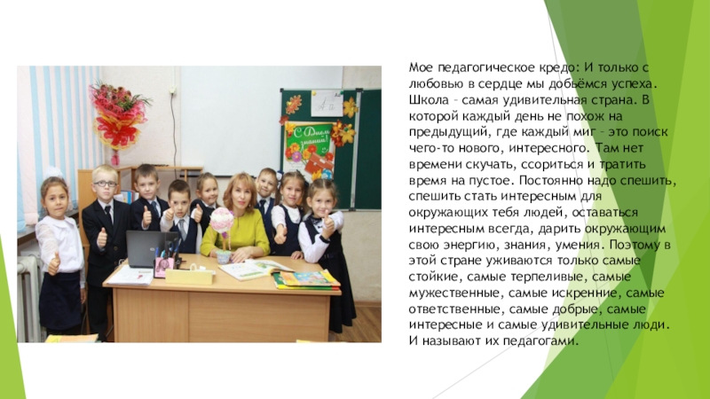 Мое педагогическое кредо: И только с любовью в сердце мы добьёмся успеха. Школа – самая удивительная страна. В которой каждый день не похож на предыдущий, где каждый миг – это поиск чего-то нового, интересного. Там нет