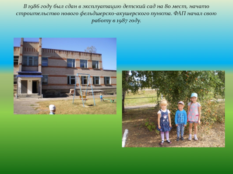 Слайд 10В 1986 году был сдан в эксплуатацию детский сад на 80