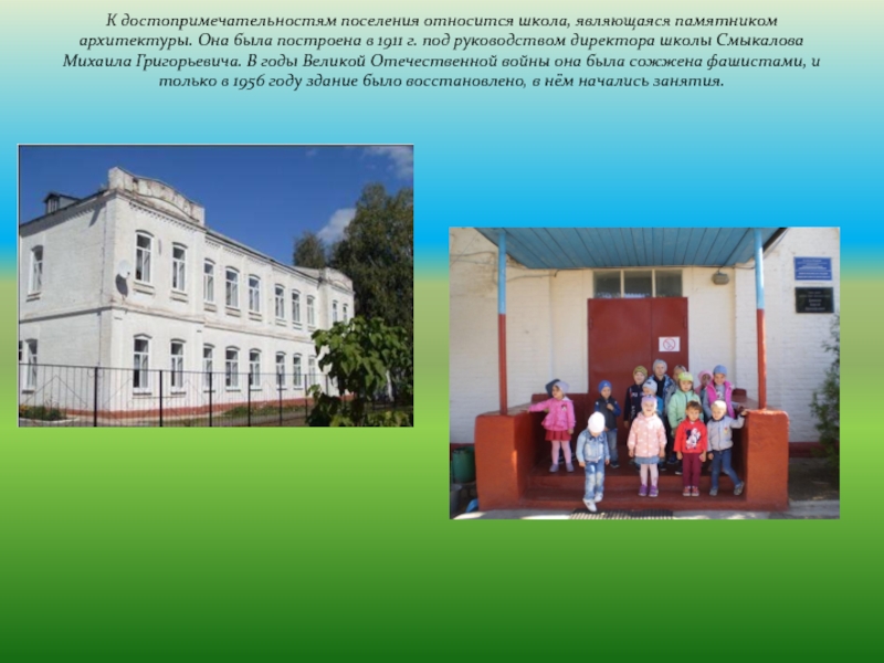 Слайд 6К достопримечательностям поселения относится школа, являющаяся памятником архитектуры. Она была построена