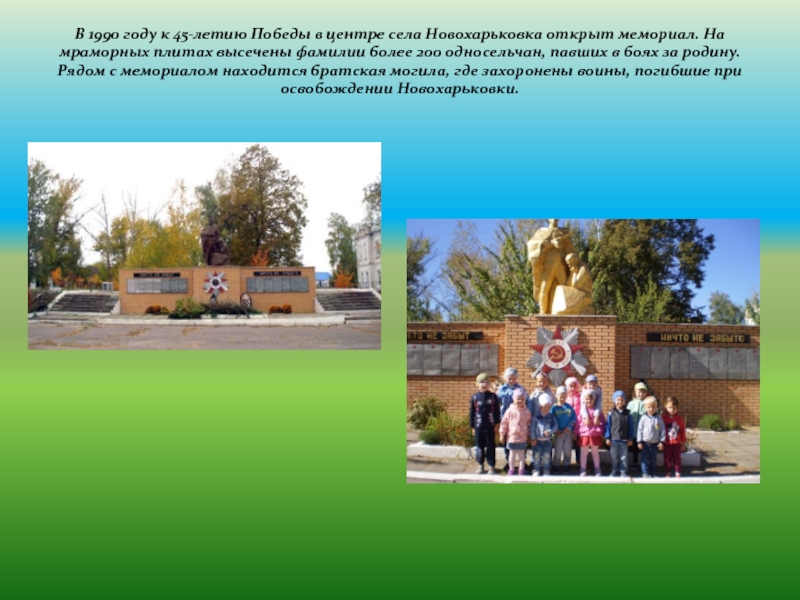 Слайд 11В 1990 году к 45-летию Победы в центре села Новохарьковка открыт