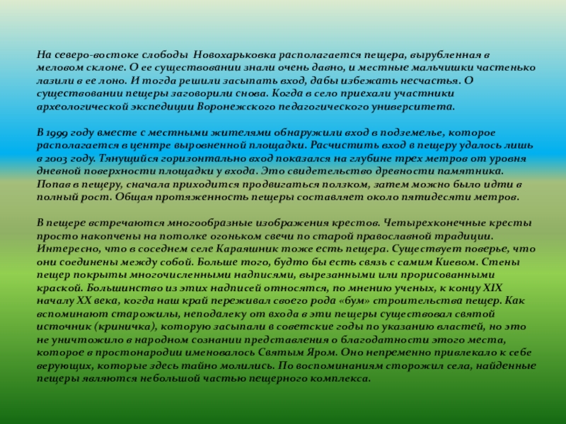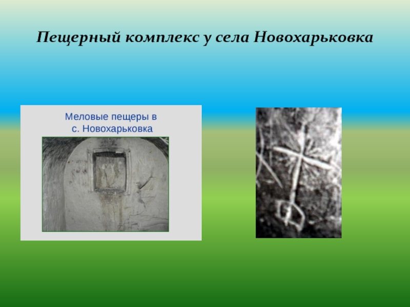Слайд 13На северо-востоке слободы Новохарьковка располагается пещера, вырубленная в меловом склоне. О