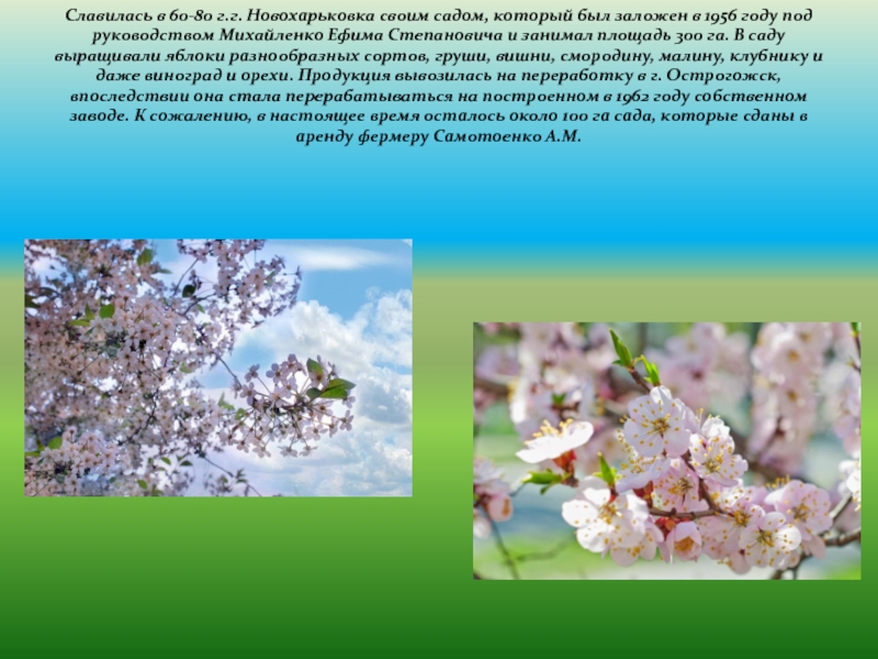 Слайд 7Славилась в 60-80 г.г. Новохарьковка своим садом, который был заложен в