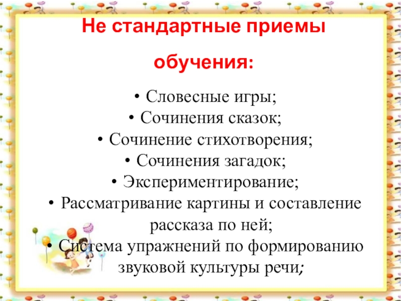 Не стандартные приемы обучения:Словесные игры;Сочинения сказок;Сочинение стихотворения;Сочинения загадок;Экспериментирование;Рассматривание картины и составление рассказа по ней;Система упражнений по формированию