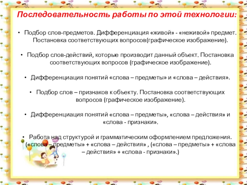 Последовательность работы по этой технологии:Подбор слов-предметов. Дифференциация «живой» - «неживой» предмет. Постановка соответствующих вопросов(графическое изображение). Подбор слов-действий, которые