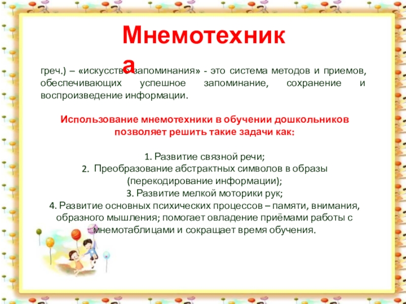Слайд 4греч.) – «искусство запоминания» - это система методов и приемов, обеспечивающих